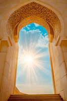 Een stralende zonnestraal breekt door een sierlijk versierde poort en creëert een warme, uitnodigende sfeer. De harmonieuze combinatie van licht en architectuur creëert een gevoel van grandeur. Ideaal voor de woonkamer, nodigt het je uit om je dromen te laten ontvouwen en het alledaagse leven achter je te laten.