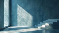 De strakke lijnen van de witte trap contrasteren sterk met de koele, blauwe tinten van de muren en vloer, waardoor een atmosfeer van rust en orde wordt gecreëerd. Het natuurlijke licht dat door de ramen valt,…