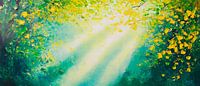 Een stralend spel van licht en kleur voert de kijker mee naar een mysterieus bos. De zachte, goudgroene tinten creëren een harmonieuze sfeer die zowel rustgevend als verfrissend is. Ideaal voor de slaapkamer of woonkamer, brengt een vleugje natuur en licht in je kamers.