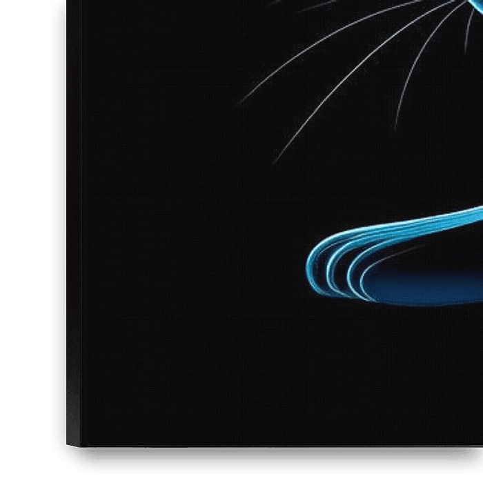 Een glinsterende schaduw ontvouwt zich elegant in de duisternis, met vloeiende blauwe lijnen die de sierlijke beweging van een naderend wezen vastleggen. Elk detail, van het lenige lichaam tot de delicate snorharen, straalt een mystieke energie uit. Het is alsof de lucht zelf de essentie van deze katachtige aanwezigheid vangt.
