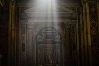 Een lichtstraal doorbreekt de duisternis in de Sint-Pieterbasiliek in Rome.