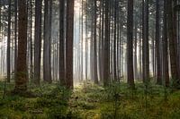 Lichtstraal in het dennenbos op een mooie herfstochtend. De herfst is het seizoen met het mooiste licht. Genieten van de Veluwe.