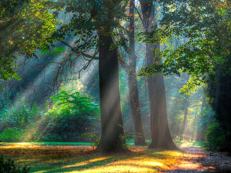 Lichtstralen door de ochtendmist van Edgar Schermaul