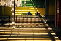 Metalen hekwerken en schaduwlijnen creëren een strak patroon dat het oog naar het midden trekt. De combinatie van geel, groen en warme highlights geeft het stedelijke interieur een optimistische sfeer, terwijl de solofiguur voor schaal en verhaal zorgt. Past bij moderne, industriële en minimalistische interieurs.