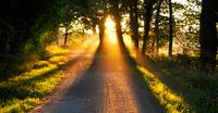 Een foto van een landschap met bomen en gras. Licht schijnt tussen de eikenbomen door op een landweg. Dansende vliegjes lichten op in de lichtstralen als kleine lampjes. Een sfeervol zomers beeld