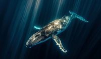Deze indrukwekkende foto toont een bultrugwalvis die zich sierlijk een weg baant door de donkerblauwe zee, verlicht door het zachte, hemelse licht dat van bovenaf komt.