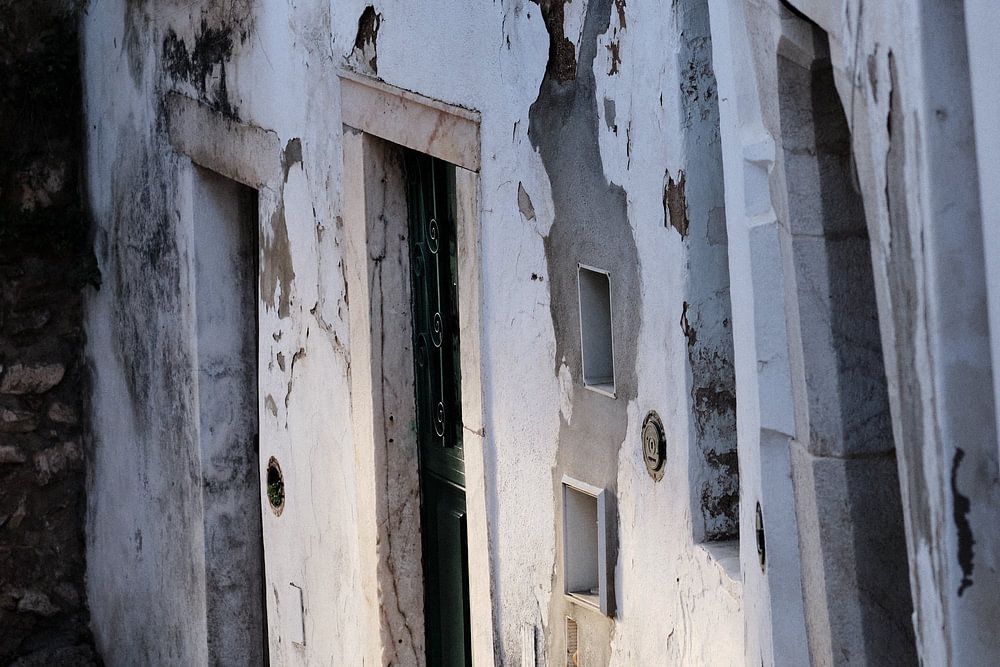 Lichtval in mooi steegje in Monsaraz Portugal. Stadsgezicht met poort en mooi straatje