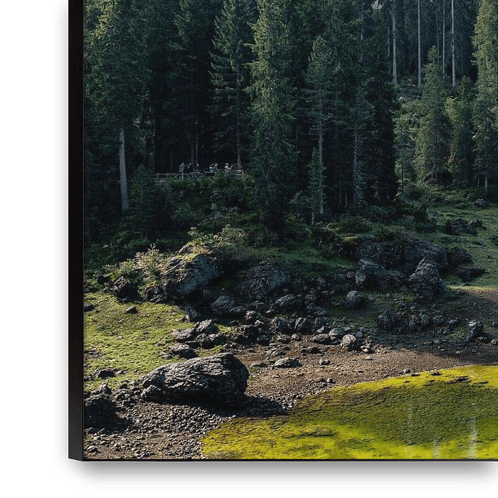 Een schitterende blik op de Italiaanse Dolomieten, vastgelegd aan de oever van het Karersee. Terwijl zonlicht door de naaldbomen filtert en reflecties dansen over het smaragdgroene water, tekenen de scherpe rotspartijen van de Latemar zich af tegen een heldere lucht. Een rustgevend en krachtig natuurbeeld dat perfect past in een modern…