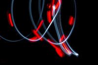 Een foto met een lange sluitertijd van twee lampjes die bewegen. Een lampje is wit en een is rood. De rode heeft geknipperd. Hierdoor is er een abstract lijnenspel ontstaan in een donkere omgeving. De kleuren zijn zwart wit en rood.