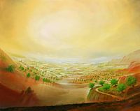 In het midden van het schilderij strekt zich een brede, bruine weide uit, omringd door…