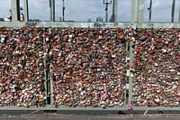 Cologne Nordrhein-Westfalen Germany Thousands of love locks line the iconic Hohenzollern railway and pedestrian Bridge. Köln Nordrhein-Westfalen DeutschlandTausende Liebesschlösser säumen die berühmte Hohenzollernbahn und Fußgängerbrücke. Hohenzollernbrücke