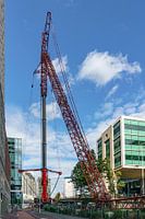 Deze foto is gemaakt op 5 augustus 2025 in het centrum van Den Haag waar de hijskraan nodig is om de installaties van de glazenwassers van de kantoren aan de Turfmarkt te vervangen.