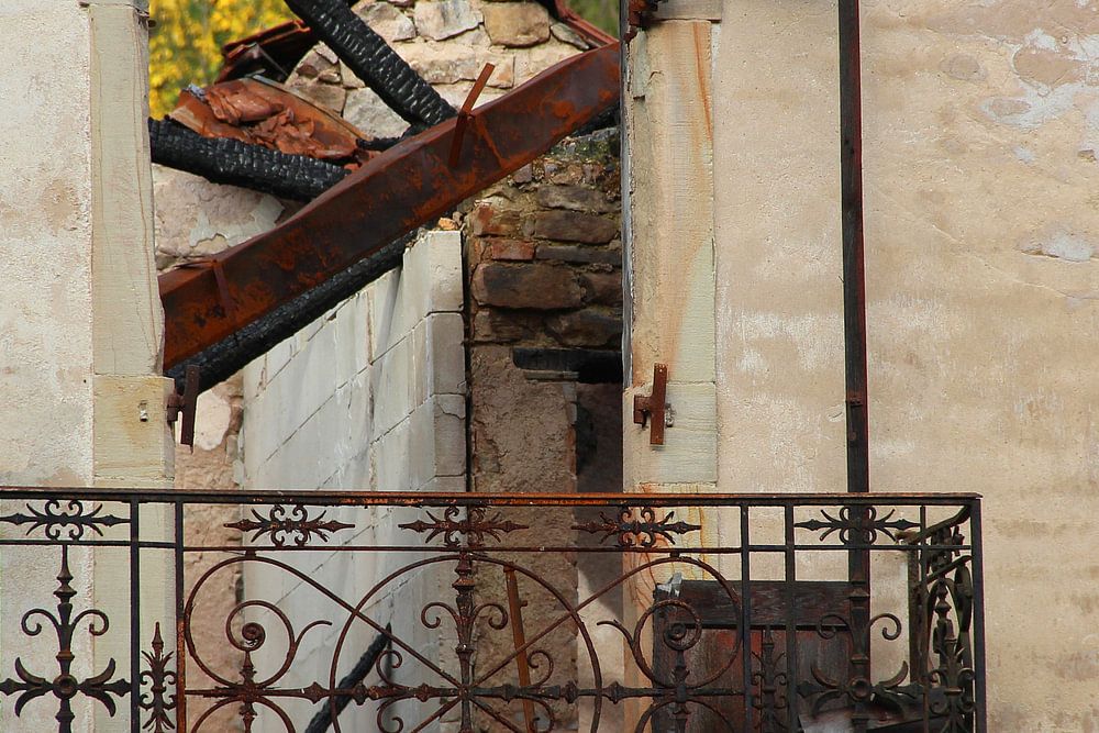 In Frankrijk worden -zeker op het platteland- heel veel huizen verwarmd met houtkachels, waardoor er regelmatig brand ontstaat. In veel dorpen vind je wel zo'n bouwval, die meestal jaren blijven staan. Op deze foto, gemaakt in Clerjus, een lief balkonnetje dat gespaard is gebleven, terwijl de rest van het huis volledig is verwoest door brand.