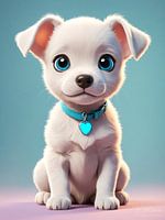 A.I. portret van een wit hondje genaamd Bella met prachtige blauwe ogen en een blauw halsbandje met een hartje. De achtegrond heeft zachte pastelkleuren in roze en blauw.