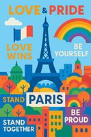 De afbeelding is een kleurrijke, gestileerde poster die de liefde en trots in Parijs viert. De Eiffeltoren staat prominent in het midden tegen een lichtblauwe achtergrond. Een Franse vlag en een regenboogboogboog zijn zichtbaar. De woorden "LOVE & PRIDE", "LOVE WINS", "BE YOURSELF", "STAND…