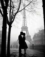 Liefde in Parijs, een verliefd stelletje zoent elkaar onder de Eiffeltoren. In zwart-wit. Kies zelf het formaat en materiaal bij dit werk en maak het helemaal passend voor jouw interieur.