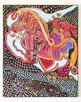 Een levendige en abstracte schilderij van een paard met een ruiter op zijn rug. Een kleurenpalet met tinten rood, oranje, roze, blauw en turquoise, dat een sterke visuele impact geeft.