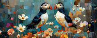 De vogels staan tegenover elkaar, hun levendige zwart-witte veren en fel oranje snavels contrasteren mooi tegen de achtergrond. Rondom de vogels bloeien wilde bloemen in een veelheid van kleuren, van zachtroze tot feloranje en wit. Het geheel lijkt geïnspireerd door mozaïekachtige kunst, waarbij geometrische vormen en blokken in verschillende blauwtinten de achtergrond vormen. De vogels en bloemen lijken bijna uit deze abstracte vormen te ontspringen, wat een bijzondere dynamiek creëert tussen natuur en abstractie.