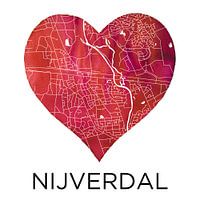 Geïllustreerde stadsplattegrond van Nijverdal en een deel van Hulsen in een hart van rode aquarel. Deze zeer gedetailleerde kunstwerk is een samensmelting van analoge- en digitale illustraties.