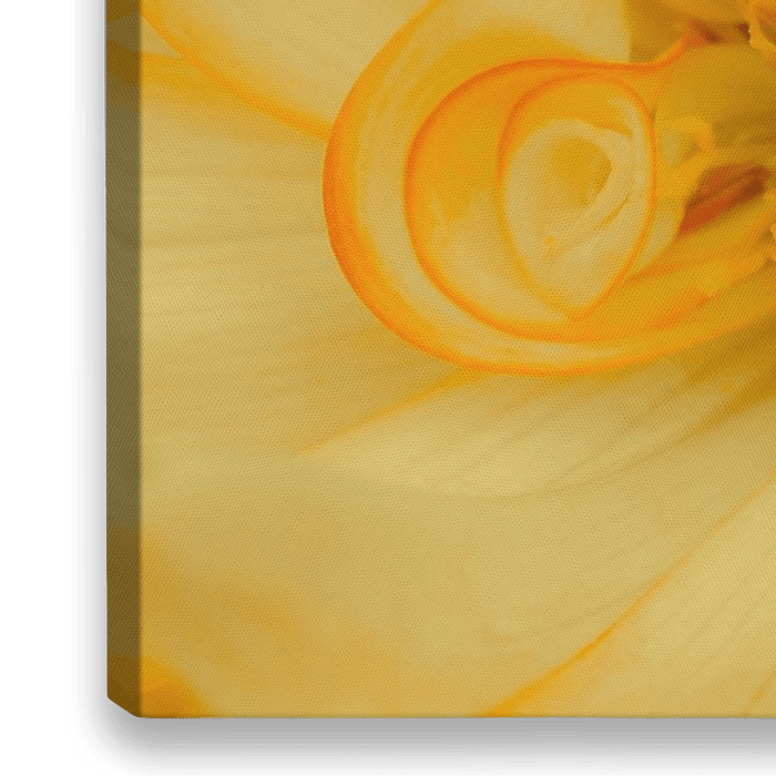 In het hart van de bloem ontvouwen zich gele en oranje sierlijke krullen. Er lijkt zelfs beweging in de krullen te zitten als een dans die opgevoerd wordt.