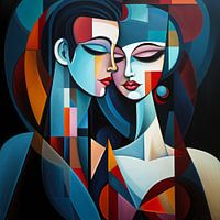 Abstract kleurrijk portret van een man en vrouw in voornamelijk blauw tinten met als thema liefde.