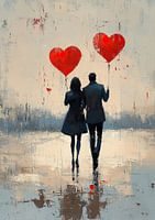 Liefdesballonnen - Dit romantische schilderij toont een man en een vrouw van achteren die beide een rood hartvormige ballon vasthouden tegen een minimalistisch, grijsachtig achtergrond.