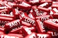 Rode medische capsules met de opdruk "LOVE". Liefde als medicijn!