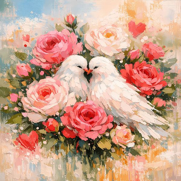 Een teder, romantisch schilderij van twee witte duiven, omringd door een zee van roze en rode rozen. De zachte, pastelkleurige penseelstreken en het harmonieuze kleurenpalet geven het werk een vredige, liefdevolle uitstraling. Een ideaal kunstwerk voor iedereen die warmte, verbondenheid en poëtische symboliek in de moderne schilderkunst…