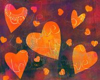 Love hearts is een abstract acrylschilderij in liggend formaat geschilderd door de kunstenaar Karen Kaspar. Harten en het woord liefde in verschillende groottes dansen op een abstracte achtergrond. De harten zijn geschilderd in levendige tinten warm oranje en roze en stralen op de achtergrond in contrasterende tinten paars en groen.