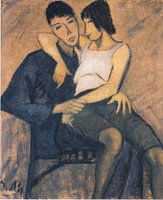 Hier zit een koppel op een stoel, binnen in een interieur. Van het echtpaar zit de vrouw op schoot bij de man.