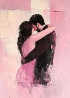 Liefdespaar | Roze Omhelzing - Dit liefdesschilderij toont een man en vrouw omarmd in een intieme knuffel, geschilderd in een abstracte stijl met een dominante zachte roze achtergrond en zwarte, witte accenten die diepte en emotie toevoegen.