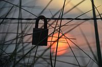 Liefdesluis op een hek op het duin met uitzicht op de zee bij zonsondergang, Callantsoog, Noord-Holland, Nederland