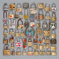Een collage van liefdesslotjes uit Amsterdam. Deze zijn eigenhandig versierd en beschreven door de geliefden die het aan de brug hebben gehangen.