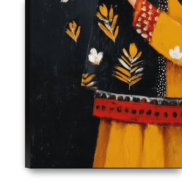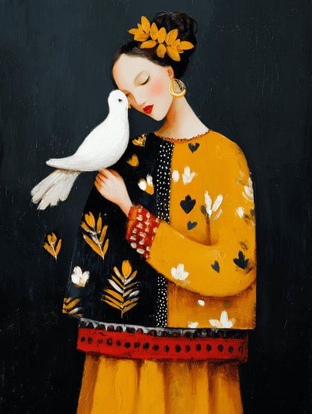 Een liefdevol en dromerig vrouwenportret met een witte vogel als symbool van rust, vrijheid en verbondenheid. De vrouw leunt met gesloten ogen zacht tegen de vogel aan, alsof ze een geheim deelt in stilte. De diepe donkerblauwe achtergrond maakt het beeld intiem en krachtig, terwijl de warme okergele tinten en roodaccenten zorgen voor…