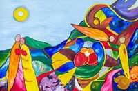 Als je verliefd bent, is de wereld mooi en heb je vooral oog voor elkaar. Dit kleurige werk heb ik gemaakt in het begin van mijn relatie en hangt nog altijd in mijn woonkamer. Door de felle kleuren spreekt het mijn bezoek altijd aan. Een deel van de gebruikte symbolen/vormen zijn voor iedereen herkenbaar.