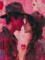 Twee geliefden, gekleed in denim en hoeden, staan tegenover elkaar in een intieme pose terwijl hun neuzen bijna elkaar raken. De achtergrond is gevuld met expressieve roze tinten, ruwe penseelstreken en subtiele hartdetails die de passie en verbondenheid in het werk versterken. De combinatie van texturen en kleuren geeft dit schilderij…