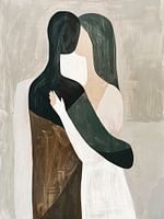 De vrouw, weergegeven in lichte tinten met lang haar, en de man, weergegeven in donkere tinten, staan dicht tegen elkaar aan, hun hoofden naar elkaar toe gebogen, wat een gevoel van tederheid en bescherming uitstraalt. De achtergrond bestaat uit zachte, neutrale kleuren met subtiele penseelstreken die de figuren naar voren brengen zonder af te leiden van hun interactie.