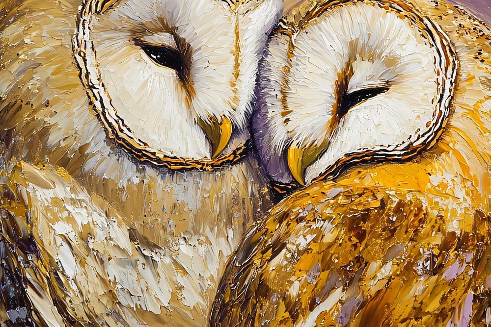 Dit prachtige schilderij toont twee uilen die liefdevol tegen elkaar aan leunen, omgeven door warme gouden en paarse tinten. Het gebruik van expressieve penseelstreken en levendige kleuren geeft het werk een moderne en artistieke uitstraling. Perfect voor wie op zoek is naar een uniek stuk om een persoonlijke sfeer te creëren in elke ruimte. Dit ontwerp straalt warmte, intimiteit en elegantie uit, ideaal voor in de slaapkamer of eetkamer.