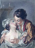Een jongen en een meid staan op dit portret, verliefd en elkaar liefhebbend. Hij zit bij haar aan de borst, waardoor ze half topless met haar tiet bloot op het kunstwerk staat en ze staan op het punt een kus te geven.