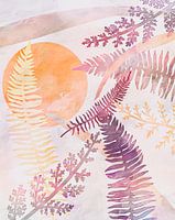 Geïnspireerd door het impressionisme presenteer ik je een prachtig botanisch natuurschilderij van bladeren en bloemen met pastelkleurige vormen en een warme zon op een crèmekleurige beige achtergrond.