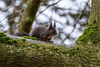 Schattige eekhoorn in een boom met donkerbruine vacht