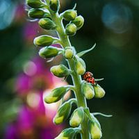 In het zachte avondlicht vermaken twee lieveheersbeestjes zich opperbest op de vingerhoedskruid