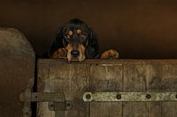 Sfeervolle kleuren foto van een nieuwsgierige kerry beagle (foxhound, jachthond, honden) die met poten over de rand van de houten staldeur staat te kijken en graag naar buiten wil. Boerderij, waakhond, stal, erf, brocant, boederijleven.