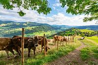 Lieve kudde koeien op de Kapf bij Oberstaufen met uitzicht op het Weißachtal