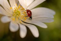 Dit lieveheersbeestje komt net van 1 van de blaadjes van de bosanemoon af geklauterd.