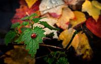 Een rustgevend beeld van een lieveheersbeestje op een groen blad. De achtergrond is wat wazig gemaakt zodat het lieveheersbeestje en het groene blad meer lostkomt van de achtergrond. Een lieflijk beestje tegen een warme herfst achtergrond.
