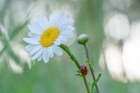 Macrofoto van een lieveheersbeestje die loopt over een margriet bloem.