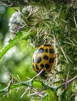 Lieveheersbeestje wringt zich een weg doorheen de doornen van een distel