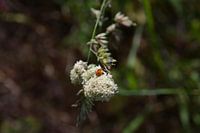 Lieveheersbeestje of kapoentje op een grasspriet van bovenaf gefotografeerd