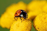 Macrofoto van een lieveheersbeestje op gele bloemen